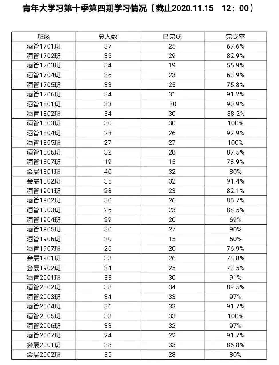青年大学习第十季第四期学习情况总体较上期相对良好,全学院完成率到达74.45%,特在此表扬酒管1803班,酒管1805班,酒管2005班完成率到达100%优秀,在此批评酒管1703班,酒管1906班,完成率未到达60%不合格。希望完成率高的班级再接再厉,更上一层楼,请完成率低的班级对大学习务必引起重视,谢谢配合!
