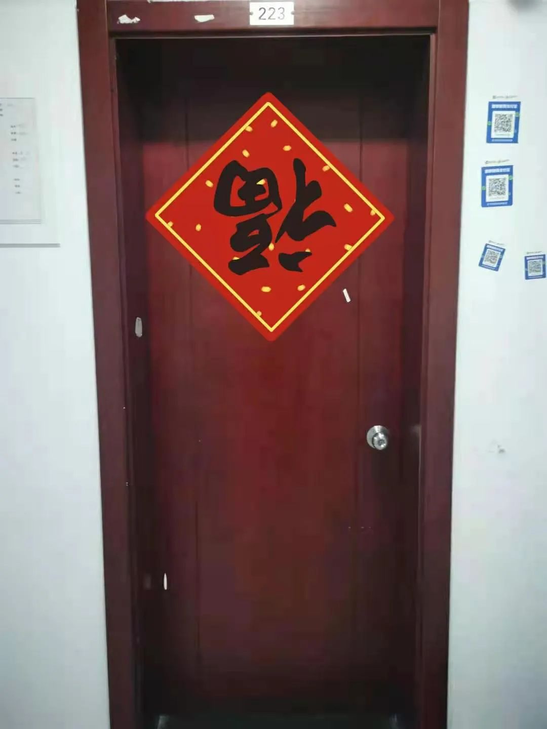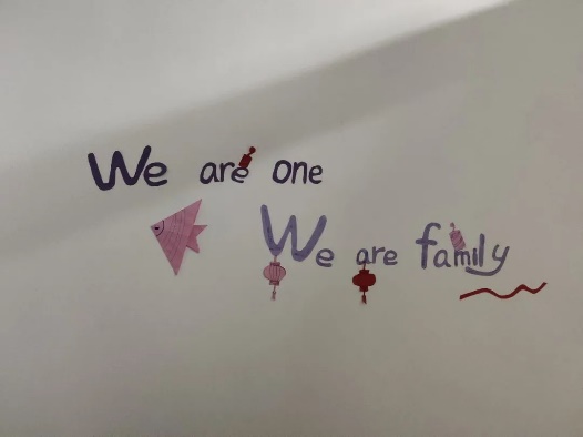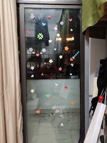 寝室墙上的“We are family”是我们寝室的口号,希望在新的一年里我们可以一直其乐融融犹如一个团结的小家庭。因此,墙上的每一个剪纸以及玻璃移门上的每一朵小花,都记录了我们每一个人的喜悦与寄望。大家都希望在新的一年里能快快乐乐,平平安安。