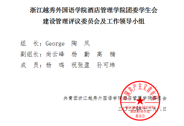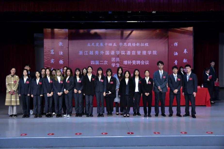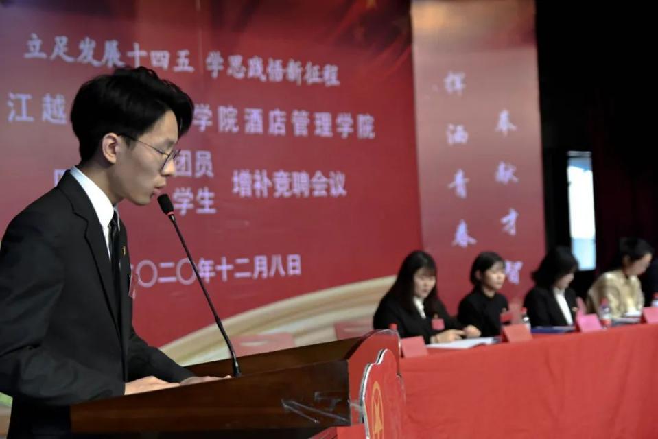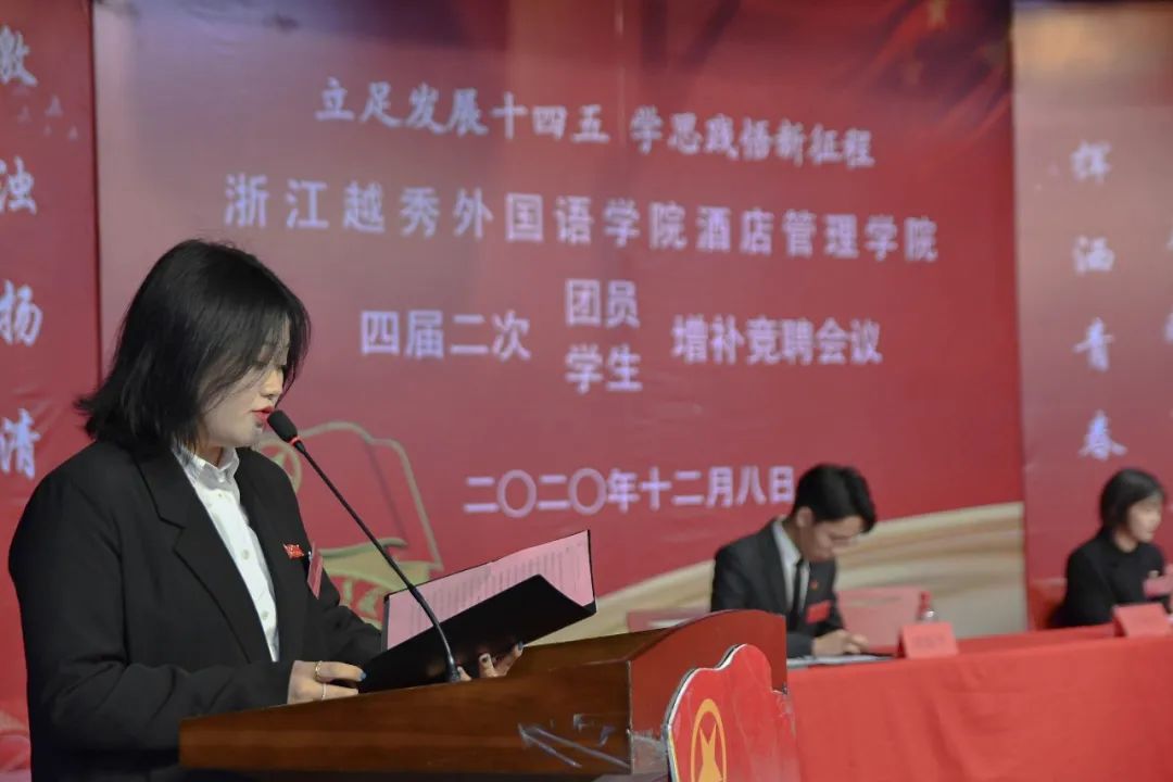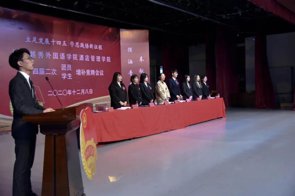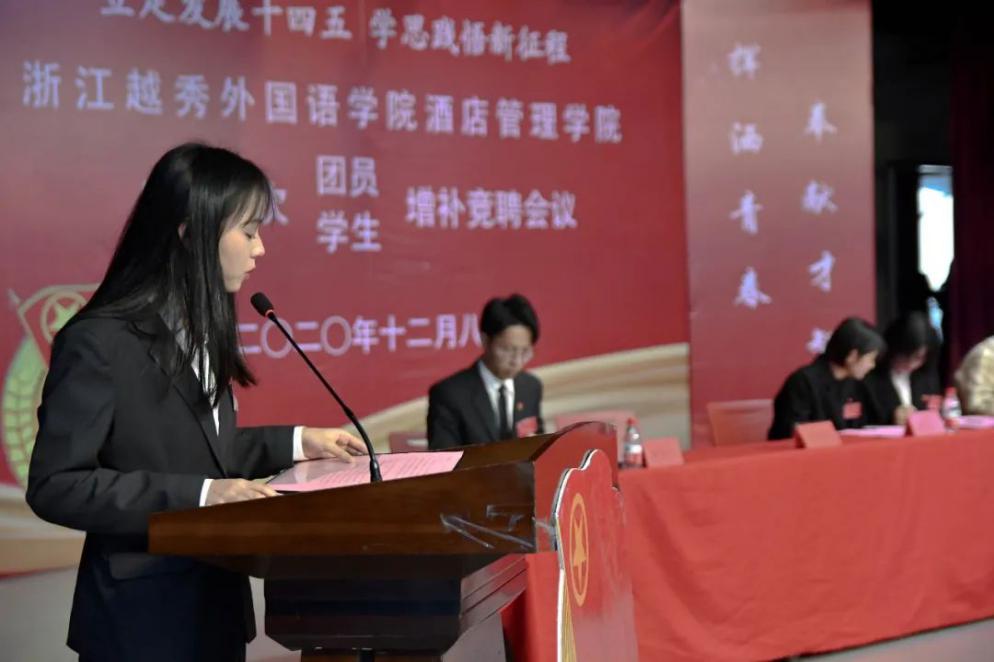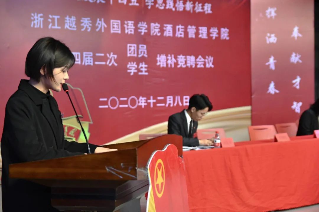 2020年12月8日,浙江越秀外国语学院酒店管理学院在报告厅举办《浙江外国语学院酒店管理学院第四届二次团员、学生增补竞聘会议》。出席本次大会的正式代表210名,其中,共青团第四届团委委员会委员8名,第四届学生委员会委员8名;团委委员候选人9名,学生委员候选人21名。其中,应到210人,实到210人。