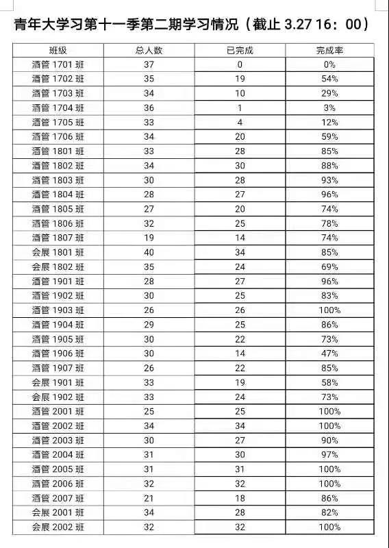 青年大学习第十一季第二期学习情况总体不良,目前全学院完成率为81.89%,特再此表扬酒店管理2001班,酒店管理2002班,酒店管理2005班,酒店管理2006班,酒店管理1903班,会展经济与管理2002班完成率到达100%,在此批评酒店管理1701班,酒店管理1702班,酒店管理1703班,酒店管理1704班,酒店管理1705班,酒店管理1706班,酒店管理1906班,会展经济与管理1901班完成率低于60%不合格,请各团支书继续保持对大学习学习情况的重视,谢谢配合!