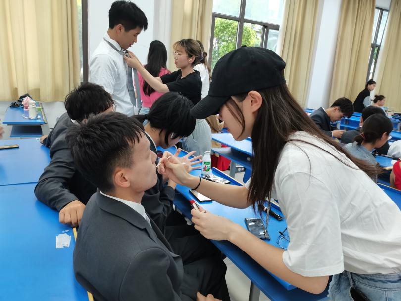 工作人员早早布置会场,并为表演者送来绿豆冰沙、润喉糖,给炎热的夏天增添一抹清凉。在候场教室,男生们披上整齐的西装,系上蓝白色领带;女生们着上红色礼服,头戴羽毛状发箍;在各位干事悉心帮助下,同学们整理好妆容,以最饱满的精神迎接比赛!
