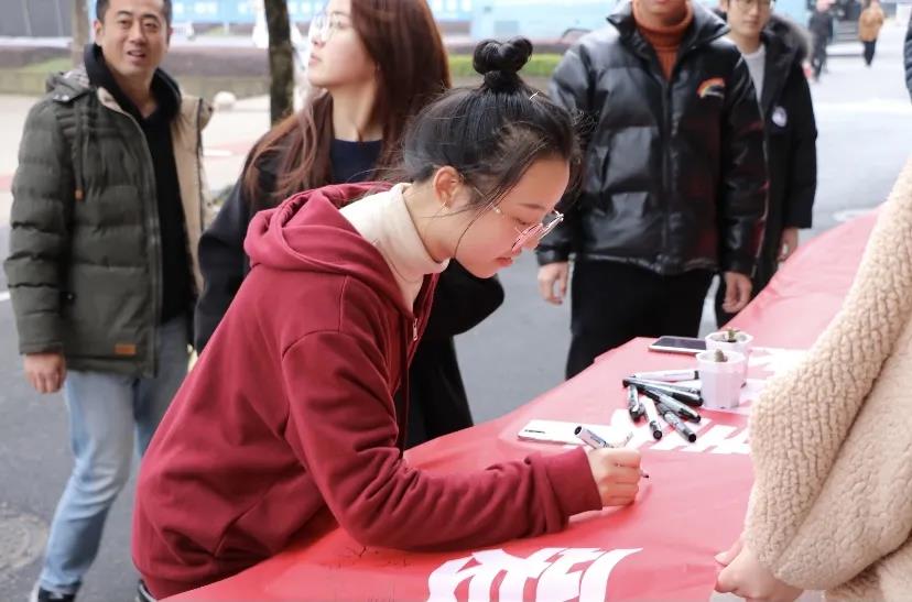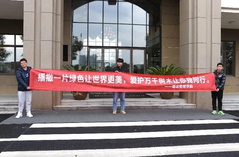 越秀师生在“播撒一片绿色让世界更美,爱护万千树木让你我同行”横幅上留下自己的姓名。
