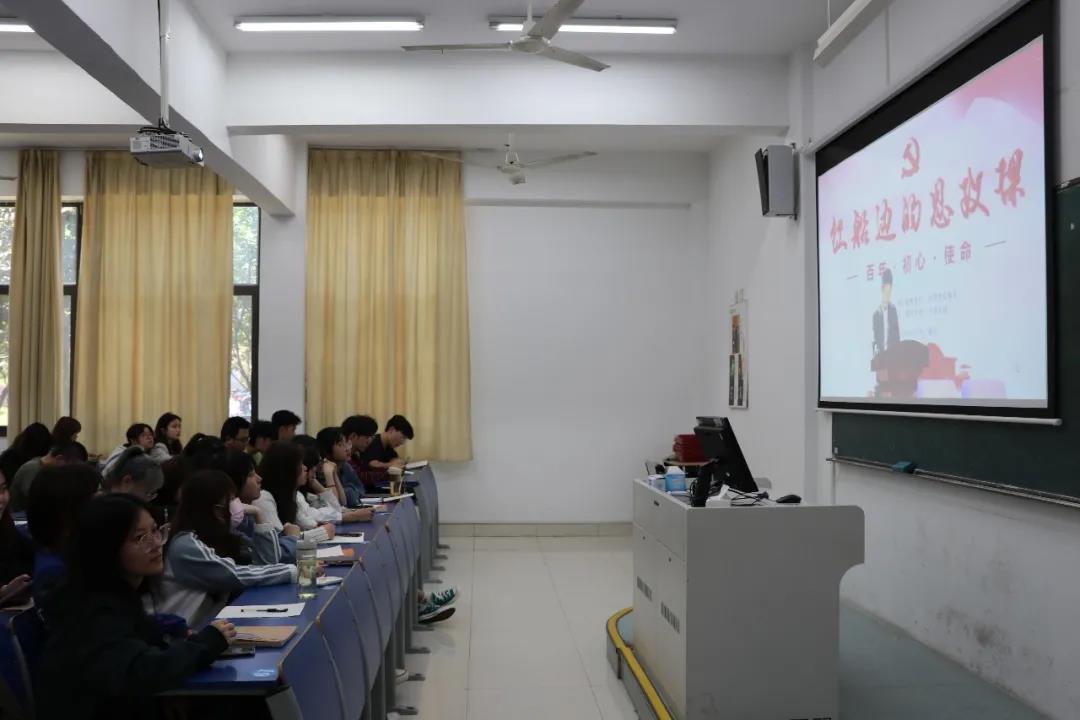 为热烈庆祝中国共产党成立100周年,深入开展党史学习教育,推进大中小学思政课一体化建设,2021年4月20日下午15:00,酒店管理学院组织没有课的老师和学生在1-126教室开展了“百年·初心·使命”师生同上一堂思政课的集体看学习视频活动。