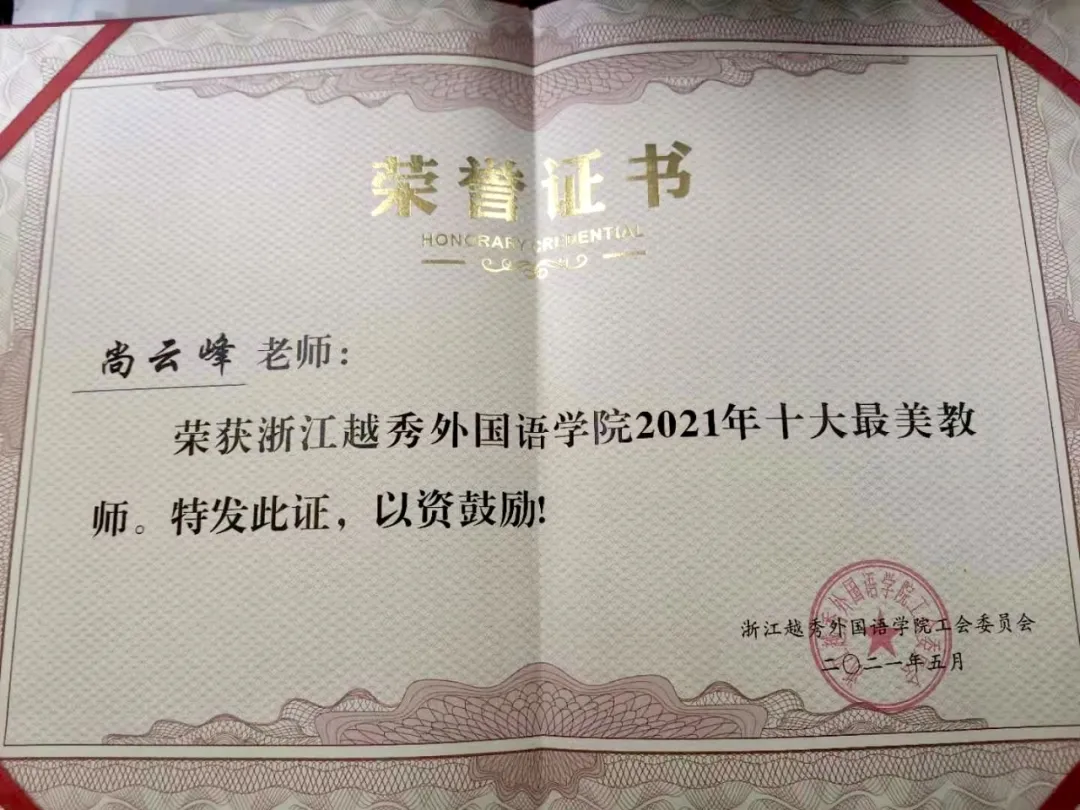 Honor@YIHA丨我院尚云峰老师获浙江越秀外国语学院2021最美教师称号!