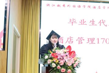 毕业生代表酒管1704班季晓晗发表真挚的感言,她回忆了往日中从懵懂到成熟的自己,并表示这一切都离不开辛勤培育自已的母校和孜孜不倦教导我们的老师,所有毕业生将永远感谢母校与老师的付出。同时她祝愿酒店管理学院越来越好,祝愿同窗四年的好友前程似锦、未来可期。