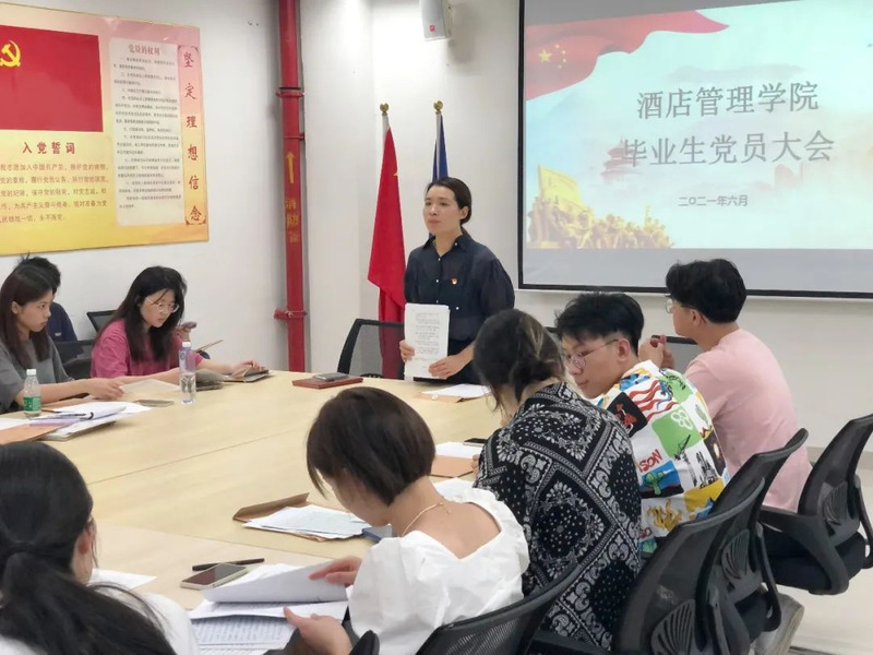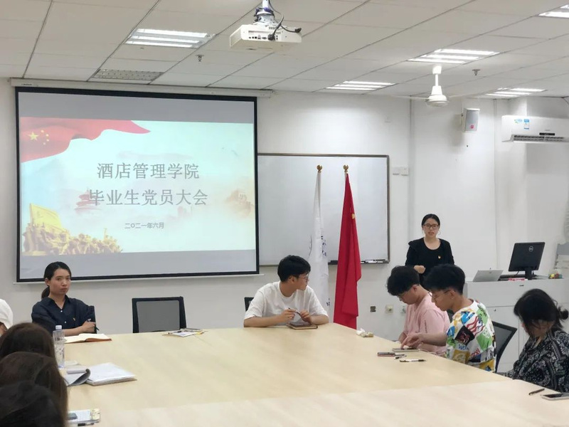 2021年6月17日,酒店管理学院2021届毕业生党员大会顺利召开。参加本次大会的有学院党委副书记杨勤,组织员杨鸣,学生第一党支部书记高楠,学生第二党支部书记孙可玮及全体毕业生党员。本次会议由高楠老师主持。