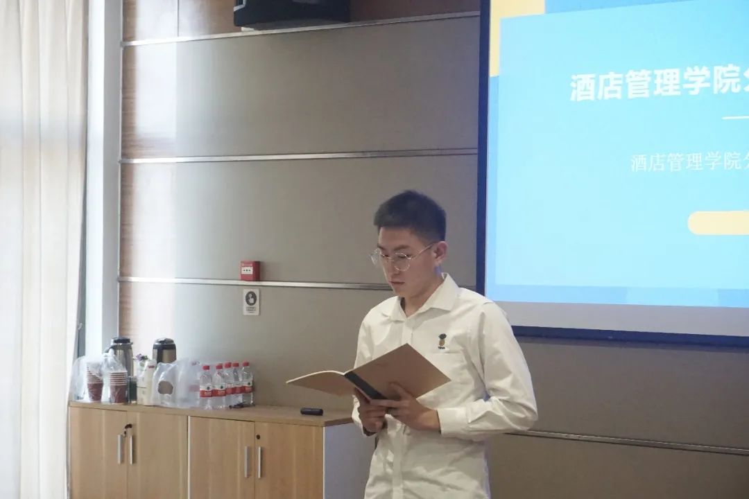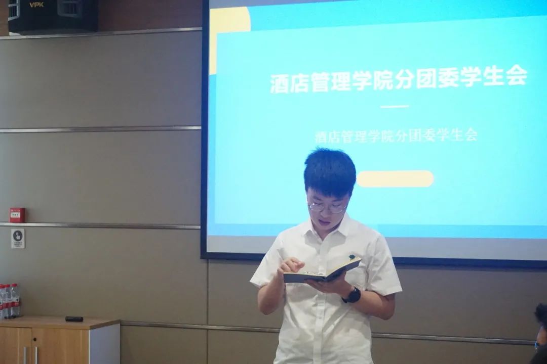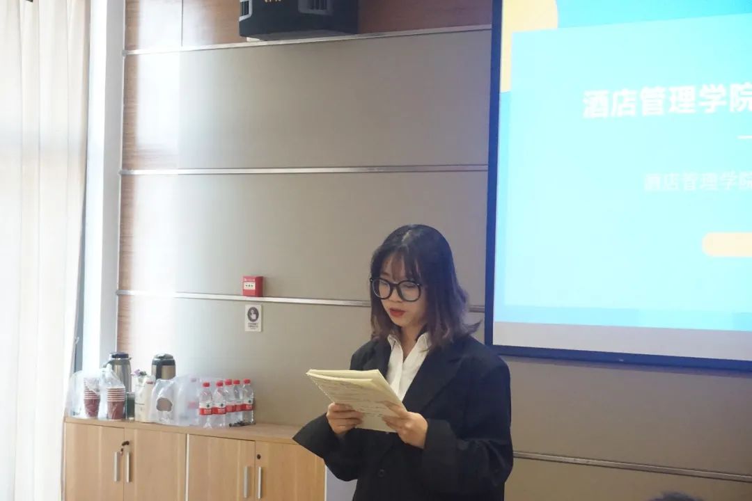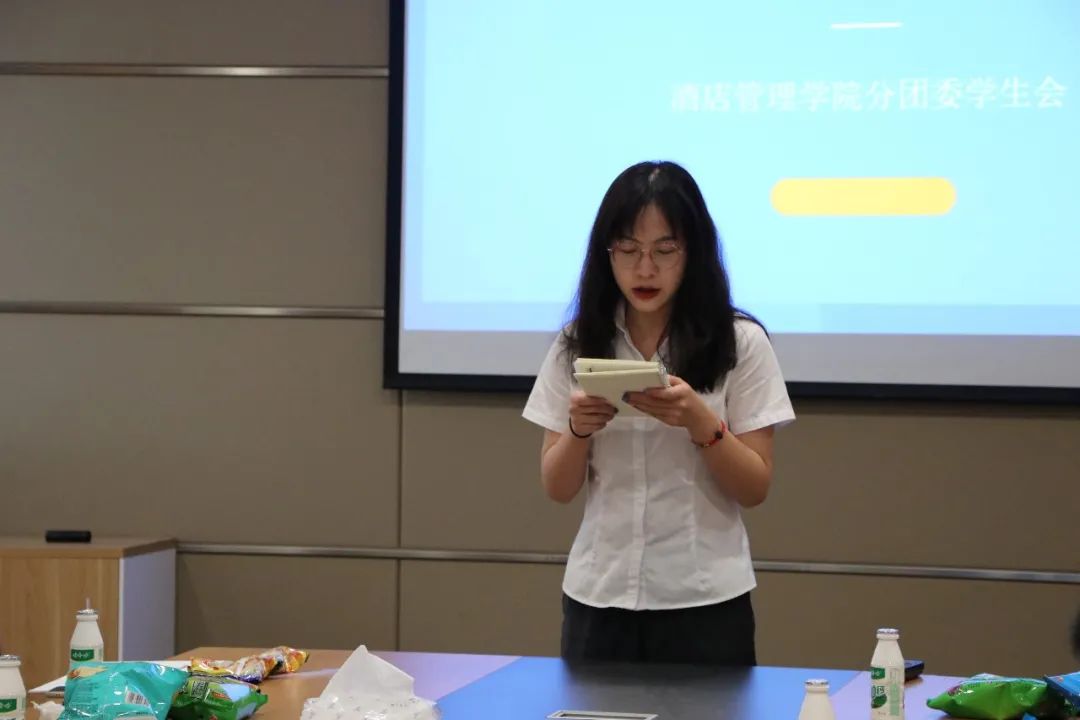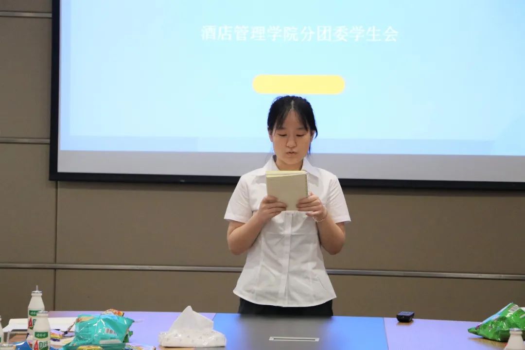 组织部部长何琦涌汇报他们上学期的工作汇总,组织部紧跟党的脚步,积极贯彻党的精神,在办事水平上有计划,有规划,倡导高效率的执行。同时她也表示部门内存在的不足,也针对性的提出解决的方法,并希望组织部能继续在团学事业道路上奋勇前进,为酒店管理团委学生会做出更大的贡献。