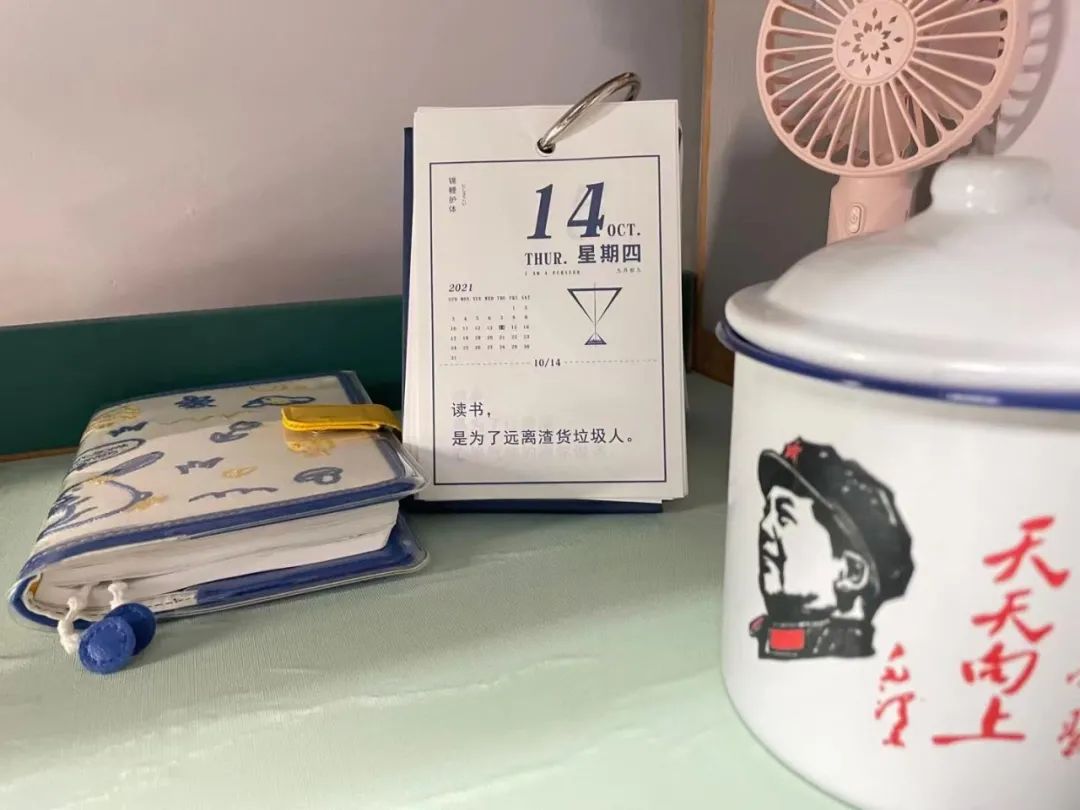 题的寝室,寝室阳台门上方贴有列宁,马克思的画像以及党旗,四面红旗时刻提醒我们爱党